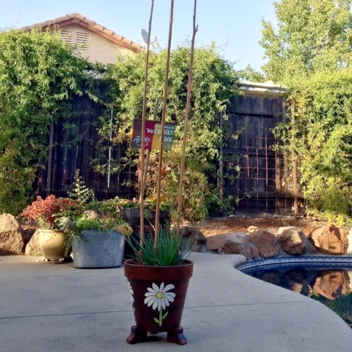 The key to keeping the stems straight was the PVC pipe we buried in the dirt. Greg cut it for me, and then I painted it. The sticks are the perfect resting area for any dragonfly. Put it close to water, (she also has a pool) and they will come!